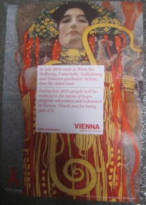 Vienna is a mix of formal and friendly – people are well-dressed but happy to chat.  The city centre is clean, tidy and oozes prosperity.  Continental cities tend to house their poorer residents on the outskirts.  ‘Banlieues’ seemed (at the Caux event) to be shorthand for ‘inner city’, whereas the outskirts or suburbs of London tend to be middle class and comfortably off.  My guest house had a poster (right) up in the breakfast room which looked hopeful.