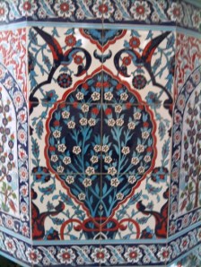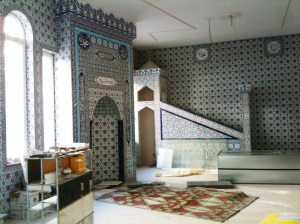 Je suis trouvé une petite mosquée près d’une très grande église. La mosquée n’est pas encore finie, mais elle est déjà belle, avec des carreaux bleus et rouges.
