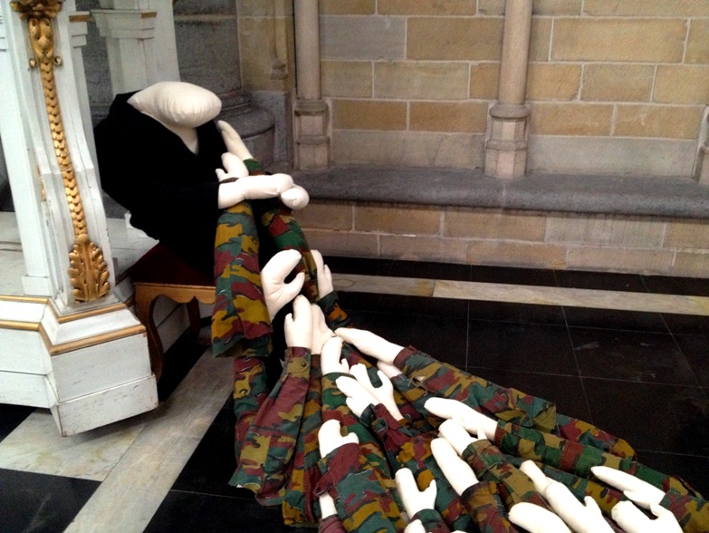 ♦ Rag doll arms in camouflage reaching towards a figure beneath the pulpit.