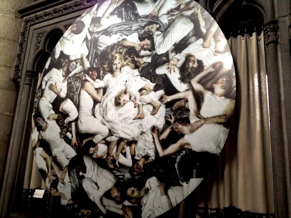 ♦ A wretched body covered by a blanket under the gaze of stone carved saints.